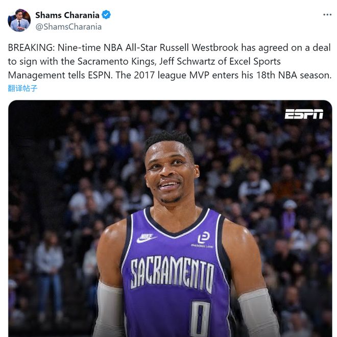 据名记Shams报道,威少已经同意加盟国王,据Shams补充报道,威少和小萨、德罗赞、拉文的关系很好,和国王的总经理、主教练也有着良好关系,所以国王对于引入威少是很积极的。